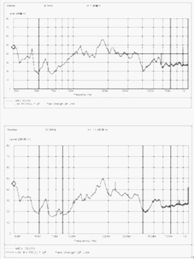 EMI輻射發(fā)射試驗(yàn)進(jìn)一步驗(yàn)證開(kāi)關(guān)管驅(qū)動(dòng)緩沖電阻大小對(duì)整個(gè)DC-DC轉(zhuǎn)換器EMI水平的影響。圖2為轉(zhuǎn)換器B采用非夾繞變壓器時(shí),當(dāng)驅(qū)動(dòng)電阻取值為1Ω和47Ω(反向并聯(lián)有二極管)時(shí)的輻射干擾??梢钥闯鲈龃篁?qū)動(dòng)電阻后,30MHz和接近200MHz的頻點(diǎn)各有3_5dB的明顯改善。
