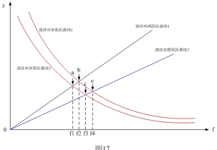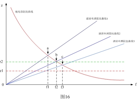 圖16表示C5電容與L0、L1、L2等電感濾波器的頻率-阻抗特性圖。圖16中紅線(xiàn)表示設(shè)備對(duì)地電容C5的頻率阻抗曲線(xiàn);藍(lán)線(xiàn)是濾波電感L0、L1、L2的頻率阻抗曲線(xiàn)。