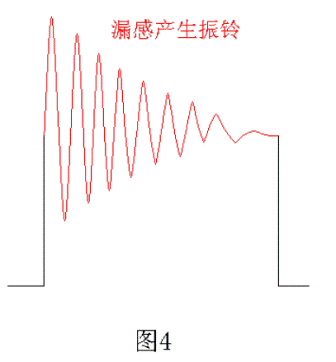 由于變壓器的初級有漏感,當電源開關管V1由飽和導通到截止關斷時會產(chǎn)生反電動勢,反電動勢又會對變壓器初級線圈的分布電容進行充放電,從而產(chǎn)生阻尼振蕩,即產(chǎn)生振鈴,如圖4所示。變壓器初級漏感產(chǎn)生反電動勢的電壓幅度一般都很高,其能量也很大,如不采取保護措施,反電動勢一般都會把電源開關管擊穿,同時反電動勢產(chǎn)生的阻尼振蕩還會產(chǎn)生很強的電磁輻射,不但對機器本身造成嚴重干擾,對機器周邊環(huán)境也會產(chǎn)生嚴重的電磁干擾。