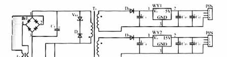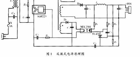 輸入為交流85~200V,經(jīng)功率二極管整流橋變?yōu)橹绷鳎鳛镈C/DC反激變換器的輸入,輸出為三組直流:5V、15V、20V,另外還有一輔助電源5V,用來給光耦NEC2501供電。控制電路為反饋控制,開關(guān)選用TOPSwitch電源芯片(TOP223)。TOPSwitch為三端離線式PWM電源集成控制器,它將PWM控制器與功率開關(guān)MOSFET合為一體,采用TO-220或8腳DIP封裝,除D、C2腳外,其余6腳連在一起作為S端。