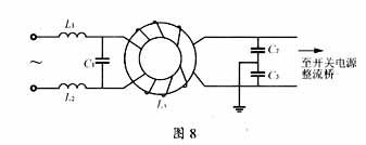 為更好抑制EMI對(duì)電路的一些改進(jìn)本電路中主要的EMI是電源噪聲對(duì)電網(wǎng)的干擾??蓪⒃瓉淼墓材6罅魅2與電容C10、C1組成的濾波電路,改善為如圖8所示電路,則L1、L2、C1可除去差模干擾,L3、C2、C3可除去共模干擾。L1、L2的磁芯為不易飽和的材質(zhì)。C1可選陶瓷電容,耐壓必須考慮輸入電壓的最大可能值,通常選用0.22~0.47μF。L3是共模扼流圈。選定C=C2=C3,截止頻率f0,則可根據(jù)計(jì)算L3;選定C1,截止頻率f0,可計(jì)算出L1、L2。