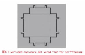 當(dāng)測試后才進(jìn)行腔體安裝,或PCB板的產(chǎn)量很大時(shí),選擇五面腔體更節(jié)省成本。這種選擇能通過焊接管腳,點(diǎn)焊角或?qū)附菍?shí)現(xiàn),也可通過熱回流孔完成加工安裝。迄今為止開發(fā)五面腔體和進(jìn)行少量生產(chǎn)最省錢的方法是選用曲線加工五面腔體。如圖5所示,它是通過在平板上加標(biāo)識(shí)完成。當(dāng)將它們安裝在PCB板上時(shí),用戶只需將其折疊成想要的形狀即可。