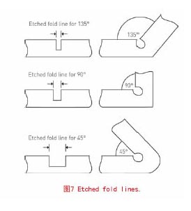 PCM有一些優(yōu)點(diǎn),加工和工具修改花費(fèi)較低,整個(gè)過程所需要的時(shí)間較短。彎線可以被很精確的蝕刻出來,例如,135,90或者45度,如圖7。整個(gè)過程沒有毛邊和金屬應(yīng)力,磁和其他金屬特性不變??梢院芊奖愕挠糜趶?fù)雜的設(shè)計(jì),產(chǎn)品有縫,軌道限界孔,徽標(biāo)和其他細(xì)節(jié)不會(huì)增加最后的費(fèi)用,這可以使設(shè)計(jì)者隨意設(shè)計(jì)他們想要的東西。