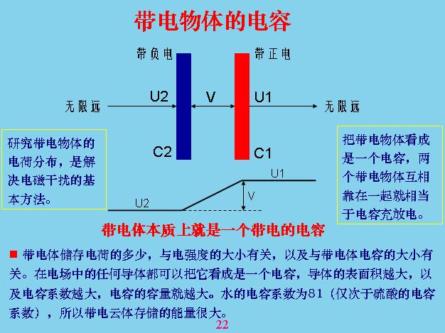 我們給大家介紹一個很重要的概念,就是電容。這個電容和我們現(xiàn)在電路里面用的電容是兩個概念,大家不要混淆。任何帶電體我們都可以把它看成一個電容,電容的大小跟它帶的電壓和電荷的多少有關,如果帶的電荷越多,電壓越高它的電流就越大。電容的概念其實與電荷的概念也是互相對應的,我們把這個電容器看成是兩個電容進行串聯(lián),也就是說帶電體帶正電,帶正電是對于無限遠的地方來說的,為什么呢?因為這個帶電以后電場分布是發(fā)散性的,中間這一點是最強,離的越遠的時候電感強度就越來越低,當無限遠的時候就等于零,你不能拿它來參考地球,參考地球的話相當于范圍太小,本身地球也可以看成電容,所以分析電容的時候最好用無限遠的地方作為參考點。也就是說我們計算電容的時候以無限遠的地方考慮,計算電容也是以無限遠的地方考慮。把這兩個電容靠在一起的時候就變成了電容器,你就可以利用這兩個電容的電位梯度和電容器來分析。任何一個帶電體都可以看成一個電容,一個孤立球導體的電容等于表面積除以半徑,再乘以電容系數(shù)。地球的容量算出來就是7×10-4(F),把兩個孤立電容進行推導,算出來就是這樣,電容器正好等于上面儲存的電容量除以電位差。明白電容的概念以后,也要分析電路的電磁感應方面,要有量的概念。有了量的概念我們可以對電磁干擾進行分析,比如說這邊是一個干擾電壓,通過這條電路進行供電,旁邊也有一個電路,這個電路就會受到干擾,干擾怎么計算?它的導向電路是什么?我們可以把兩個導線看成一個電容器,就是有一個耦合電容。等效電路相當于這邊,你要減少兩個回路互相干擾的程度就必須要減少上面的Cm電容,把兩條線隔得越遠越好,而且越短越好,只要面積越小電容器越小,離得越遠電容器也越小。