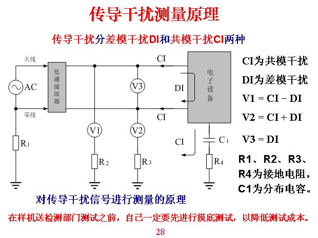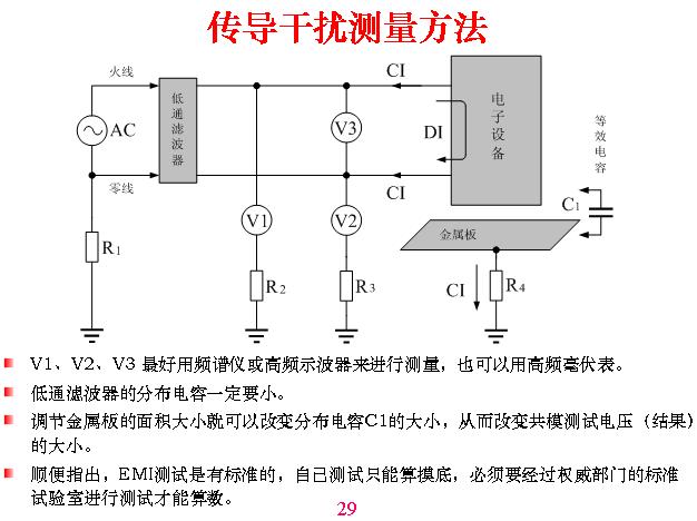 傳導干擾測量原理。這里面?zhèn)鲗Ц蓴_有兩個干擾,一個是共模,一個是差模,這樣一個回路是流進入又流出來的,這叫做差模。這兩個同時進去從另外一邊流出來叫共模,共模干擾很簡單,就是以大地為一端,另外一端是以上面的線路、設備,不管什么線為一端測到的電壓,這叫做共模干擾。因為測量的時候必須要與一根電路連接,先測三個電壓,這是測這個與大地之間的電壓,這是測兩條線之間的電壓,然后得出結算公式。V1=CI-DI,就是共模干擾減去差模干擾。V2=CI+DI,V3=DI,R1、R2、R3、R4為接地電阻,C1為分布電容,如果到檢測所去測之前自己一定要先進行摸底測試,用一塊墊板或金屬板放在下面接地,等于說分布是固定的,利用標準一塊板與機器造成分布電容,一般是一個平方米等等,是由他們定的,你可以做試驗,測多大都沒有關系,但它是固定的,測電視機是什么樣,測手機是什么樣,這是不一樣的。傳導干擾測量方法。分布電容在這一塊金屬板,與它之間產生分布電容,當然用這個板帶分布電容,測出來的結果數(shù)字越大,這只是用來做對比,以此為基礎。我們做摸底可以用大一點測,容易測得到,但你測得不算數(shù)。
