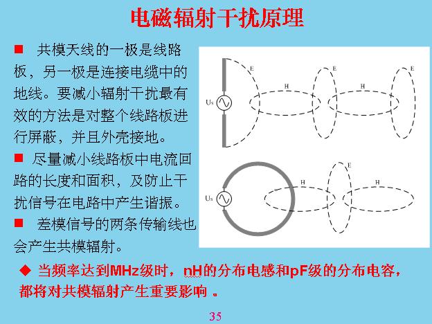 電磁輻射干擾原理。主要也是有兩種,一種是電場輻射,電場輻射最典型的就是半波陣子,如果上面這根天線的波程是半個波程,電場是最大的,現(xiàn)在一般都很少有半波程,有一段接大地,有一端作為發(fā)射天線,像中波天線就是這樣,電信天線就是半波陣子。還有一個是磁場天線,磁場天線相當于變壓器的回路,不過這個天線有參數(shù),或者半波陣子波程最好是半個波程,根據(jù)這個波程發(fā)射,不是隨便的,長的短的效果是不一樣的。電磁輻射產生這兩個陣子還會充放電,一下子到正,一下子到負,相當于電容。充放電在這里會產生磁場,這個磁場又產生電阻,這就是麥格思維,不斷、不斷的傳下去,在這里面的旋度等于面積的強度,這就是麥格思維方程。電磁波傳播是這樣的,輻射原理主要是這個原理。