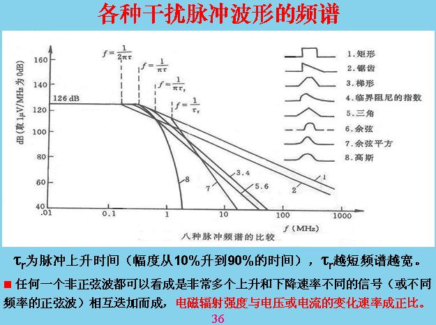 各種干擾脈沖波形的頻譜。輻射和干擾的頻率有關,頻率一般都是指正弦波,這樣比較好理解,對于方波或正弦波的波形,一般我們都可以把它看成是無窮多個上升率不同的波形進行疊加,也就是用基數(shù)展開,這是數(shù)學表達方式,比較正確是用不同的上升率,不同的波形進行疊加,但上升率不好理解,一般都是用正旋波表示。這里面波種不同的波形,它產生的干擾不一樣。這種的頻譜是最寬的,這種是高新的,接近于正弦波。120dB的時候是1v,126dB就是2v,大家知道dB是什么嗎?它一般用來表示放大倍數(shù),就是輸出電壓與輸入電壓之比,取數(shù)值大于20。為什么用這個倍數(shù)來比?用倍數(shù)比相當于把視角范圍縮小,讓你好看,如果從線性來看,一個毫伏一直到兩伏就沖到天上去了,不好看。用對數(shù)坐標表示,越往下越壓縮,前面是壓縮比較小,這邊也是。這里變成10,變成了100,變成1000,這是在電工里面用量表示,用倍數(shù)表示,每6dB就差1倍,大家記住。這里是60÷20=3,是3個據(jù)波,這里是1000微伏,120是正極,1V+6dB=2v。到測試所去測試給一個曲線,很多人問我dB是什么意思?dB就是一個坐標,后面會加一個單位,一個毫伏0dB就是一個毫伏。功率不是20倍表示了,而是用10倍表示,每3dB差一倍功率,電壓就是每6個dB差一倍。