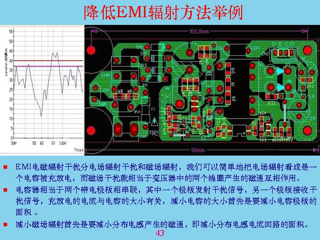 另外對于輻射干擾,我們最注意的就是共模干擾,差模干擾相對來說比共模干擾小很多,我們做過一個試驗,在同一個導線里面流過的電容,相差的共模干擾是2500倍。上面就是對輻射進行測試,剛才是共模干擾,其他都是傳導測試,其實就是輻射干擾測試,一般就是用天線來測,天線的測試原理就是這樣的,量天線和大地之間的電壓,這個設備與大地之間有分布電容,前面已經說過了,放這個在上面,與板接地產生分布電容。天線也有分布電容,分布電容不是跟設備大小和距離有關,所以測試的時候都有一個標準,固定設備中間距離有多遠,天線面積用多大,還有一套天線,很多天線,不只是一個,計最大的那個,就是測試電壓最大的那個,天線對輻射會產生諧振。