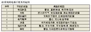 造成電源干擾復(fù)雜性的第二個原因是干擾表現(xiàn)的形式很多,從持續(xù)期很短的尖峰干擾直至電網(wǎng)完全失電,其中也包括了電壓的變化(如電壓跌落、浪涌和中斷)、頻率變化、波形失真(包括電壓和電流的)、持續(xù)噪聲或雜波,以及瞬變等。我們根據(jù)國內(nèi)外的抗擾度測試的一系列標(biāo)準(zhǔn)和實際應(yīng)用中常常出現(xiàn)的問題,總結(jié)了電源干擾的常見起因,如表1所示。