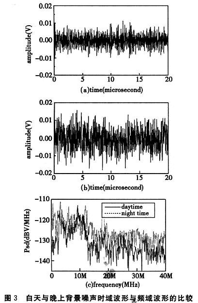 圖3(a)和(b)為在白天和晚上的噪聲時(shí)域采樣波形,(c)為白天、晚上噪聲PSD的比較。晚上的有色背景噪聲和窄帶干擾PSD比白天高出約5~15dB。背景噪聲晚上較高的可能原因是晚上用電負(fù)載的增加。