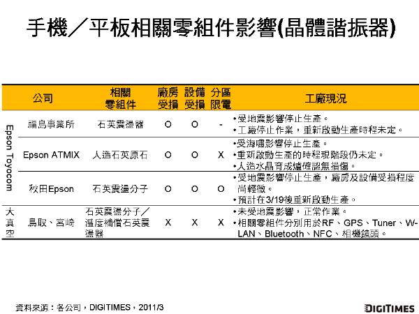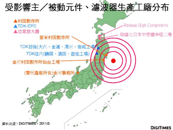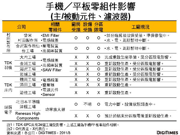DIGITIMES Research最新報(bào)告指出,日本311強(qiáng)震造成日廠手機(jī)/平板相關(guān)零組件供應(yīng)商分別遭受廠房、設(shè)備損壞,亦或海嘯沖擊、地方分區(qū)限電等影響,工廠作業(yè)停擺,影響超過(guò)20處工廠,在災(zāi)后截至2011年3月16日仍未能正常作業(yè)。