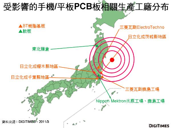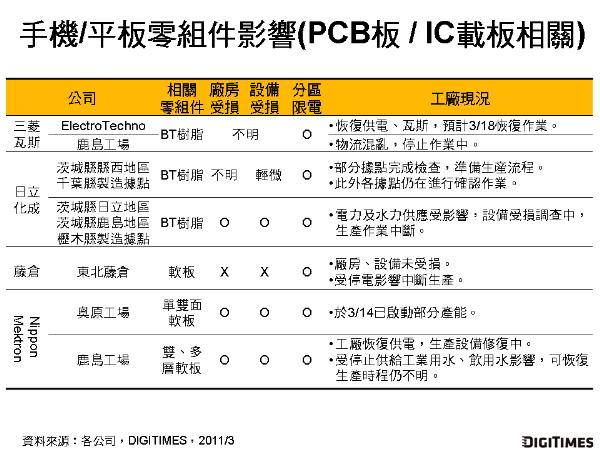 在手機(jī)/平板用PCB、IC載板材料BT樹(shù)脂等相關(guān)零組件方面,包含三菱瓦斯化學(xué)、日立化成、藤倉(cāng)、Nippon Mektron等日廠旗下工廠受地震影響作業(yè)中斷,停止生產(chǎn)。