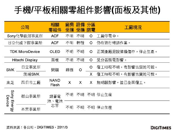 在面板、開(kāi)關(guān)、存儲(chǔ)器、電池芯、異方性導(dǎo)電膜(ACF)等手機(jī)/平板相關(guān)零組件方面,除東芝位于四日市生產(chǎn)NAND Flash的工廠未受到日本311地震沖擊,其余包含TDK、日立顯示、日立化成、SMK、Sony化學(xué)、Sony Energy Device等業(yè)者的生產(chǎn)工廠,分別受到廠房、設(shè)備受損或停止生產(chǎn)的大小不等的影響。