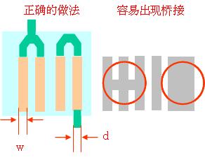 5.如果相鄰的焊盤需要相連,首先確認(rèn)在外面進(jìn)行連接,防止連成一團(tuán)造成橋接,同時注意此時的銅線的寬度。
