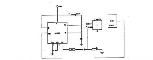 采用單穩(wěn)態(tài)觸發(fā)器NE555作為微機看門狗電路;當(dāng)系統(tǒng)工作正常時,看門狗電路不起作用,當(dāng)系統(tǒng)運行不正常時,80C51的P1.1引腳不能給定時器送去觸發(fā)脈沖,這時NE555中單穩(wěn)態(tài)觸發(fā)器就輸出脈寬大于4US負脈沖,經(jīng)F6反相后加至80C51的復(fù)位端,使系統(tǒng)可靠的復(fù)位,這樣可防止因外界干擾引起的程序跑飛,使微機程序正常運行,見圖1。