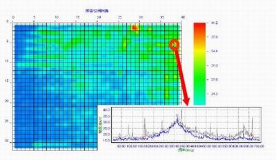 在執(zhí)行頻譜/空間掃描功能時(shí),把工作著的PCB放置到掃描器上,PCB被掃描器的柵格劃分為7.6mm×7.6mm的小格(每個(gè)小格含有一個(gè)H場探頭),執(zhí)行對每個(gè)探頭的全頻段掃描(頻率范圍可以從10kHz-3GHz)后,Emscan最終給出兩張圖,分別為合成頻譜圖(圖1)和合成空間圖(圖2)。