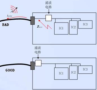 對于時鐘線、總線、射頻線等強(qiáng)輻射信號線和復(fù)位信號線、片選信號線、系統(tǒng)控制信號等敏感信號線,應(yīng)遠(yuǎn)離接口外出信號線。從而避免強(qiáng)輻射信號線上的干擾耦合到外出信號線上,向外輻射;也避免接口外出信號線帶進(jìn)來的外來干擾耦合到敏感信號線上,導(dǎo)致系統(tǒng)誤操作。
