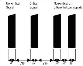 布線分離的作用是將PCB同一層內(nèi)相鄰線路之間的串?dāng)_和噪聲耦合最小化。3W規(guī)范表明所有的信號(時鐘,視頻,音頻,復(fù)位等等)都必須象圖10所示那樣,在線與線,邊沿到邊沿間予以隔離。為了進(jìn)一步的減小磁耦合,將基準(zhǔn)地布放在關(guān)鍵信號附近以隔離其他信號線上產(chǎn)生的耦合噪聲。