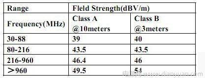 EMI測(cè)試是在特定的電波暗室中進(jìn)行的,測(cè)量由產(chǎn)品中輻射出來(lái)的電磁波強(qiáng)度,與FCC等規(guī)范相比較,不得超過(guò)規(guī)定的最大能量。FCC規(guī)范中將產(chǎn)品按用途分為CLASS A 、CLASS B 兩大類,A 類為用于商務(wù)或工業(yè)用途的產(chǎn)品,B 類為用于家庭用途的產(chǎn)品, FCC 對(duì) B 類產(chǎn)品法規(guī)要求更嚴(yán)格。下表顯示的是FCC 規(guī)范的CLASS A和CLASS B標(biāo)準(zhǔn):