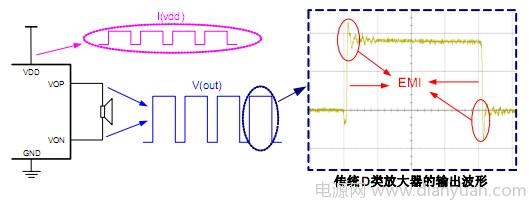 傳統(tǒng)D類放大器開(kāi)關(guān)輸出的拓?fù)浣Y(jié)構(gòu)是一個(gè)很好的EMI發(fā)射源:如調(diào)制的開(kāi)關(guān)信號(hào),開(kāi)關(guān)信號(hào)的邊沿變化,電源線上變化的電流信號(hào)等都會(huì)產(chǎn)生大量的EMI,如下圖所示。