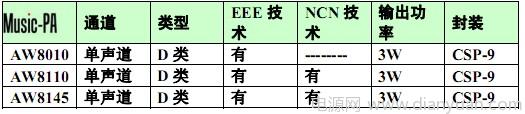 高效率、低功耗使得D類放大器的應(yīng)用越來(lái)越廣泛,D類放大器EMI也越來(lái)越受到關(guān)注。采用艾為帶有EEE技術(shù)的AW8010、AW8110、AW8145,極大地降低了EMI的輻射,簡(jiǎn)化了設(shè)計(jì)。其中音樂(lè)功放AW8110、AW8145同時(shí)還采用了獨(dú)特的、擁有專利保護(hù)的無(wú)破音(NCN:Non-Crack-Noise)技術(shù),提高音質(zhì)的同時(shí)有效地保護(hù)揚(yáng)聲器,是音樂(lè)手機(jī)等便攜式設(shè)備的理想選擇。
