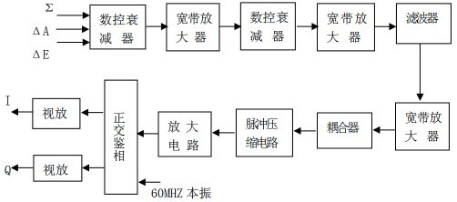 視頻接收組合是由I/Q正交鑒相器和視頻放大器組成。其中應(yīng)用數(shù)控衰減器實時調(diào)整各路本振信號的相位,以達(dá)到補償接收機系統(tǒng)相位一致性的目的。最后輸出反射和應(yīng)答的12路I/Q信號以及反射和應(yīng)答的檢波信號。