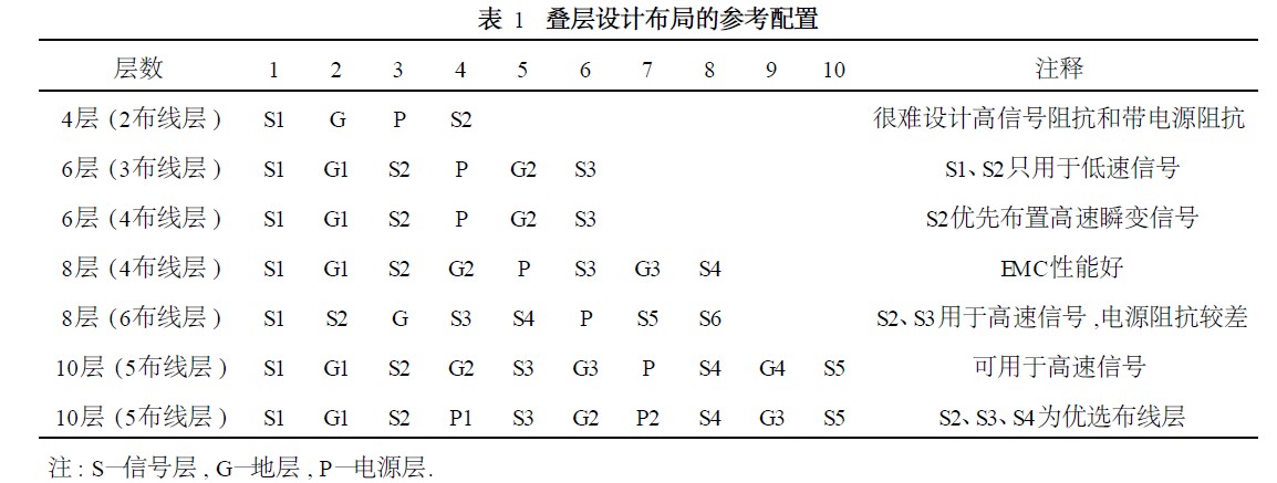 如果第2層分配為“地”,且第4層分配為處理器的電源,則過孔距離放置處理器和去耦電容器的頂層應(yīng)該盡可能短。延伸到板的底層的過空剩余部分不包含任何重要的電流,而且距離短不會具有天線作用。表1列出了疊層設(shè)計布局的參考配置。
