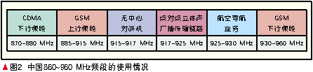 圖2顯示了中 國在860~960 MHz頻段的頻率使用現(xiàn)狀,920~925 MHz的RFID頻段實際上是立體聲廣播點對點傳輸業(yè)務(wù)頻段分出5 MHz與RFID共用,與GSM上/下行頻段只有5 MHz的頻率間隔,與無中心對講機系統(tǒng)只有3 MHz的頻率間隔。