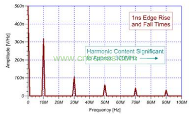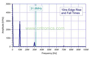 10 ns 邊緣率時(shí)方程式結(jié)果為約 31.8 MHz。曲線圖顯示,最后一次明顯諧波出現(xiàn)在30 MHz。同時(shí),圖 2 所示 1 ns 邊緣率時(shí)方程式結(jié)果為 318 MHz 最大頻率。如果您的電路易受 318 MHz 頻帶內(nèi)產(chǎn)生的頻率影響,則 EMI 諧波可能會(huì)使您的電路出現(xiàn)干擾。