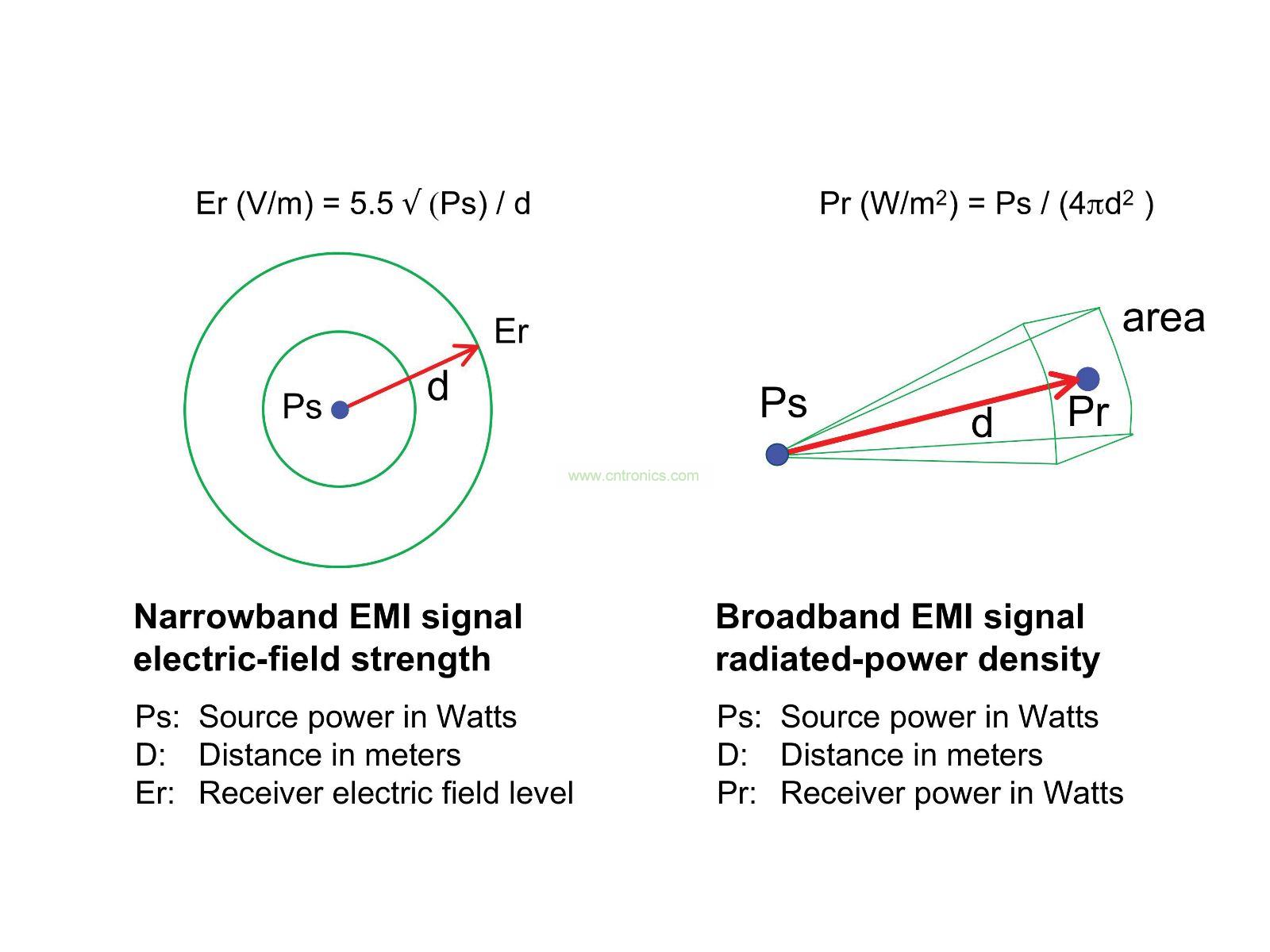 呈輻射狀的電磁干擾(EMI) 信號會從輻射源傳播至某個接收單元。根本而言,這些信號的功率或者電壓強度在“觸及”敏感的電路時,取決于發(fā)送器的功率/天線增益以及輻射源和接收器之間的距離(請參見圖1)。