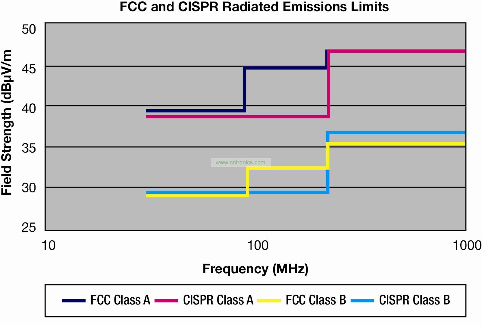 圖2 中,A 類限制針對商業(yè)、工業(yè)或者企業(yè)環(huán)境下使用的電子設(shè)備。B 類限制針對家用電子設(shè)備。A 類限制也可能適用于家用電子設(shè)備。B 類限制更加嚴格,因為這類設(shè)備可能會靠近TV和無線電接收設(shè)備放置。