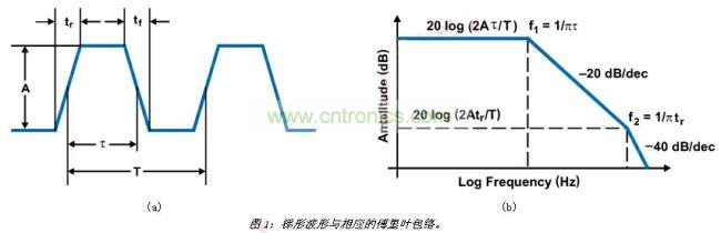對于CCM中運作的降壓轉(zhuǎn)換器,電感電流一直是非零的正電流。在這種情況下,負載周期為D=Vout/Vin,在本例中為38%(5V/14V)。使用200kHz的開關(guān)頻率時,我們很快計算出導通時間為1.8μs。為支持此頻率,控制開關(guān)的上升/下降時間必須小于90納秒。這使得我們注意到第一個減少噪聲的方法,也就是斜率控制。您可能還無法理解,但是此時我們非常了解與PWM切換節(jié)點有關(guān)的諧波,也就是開關(guān)穩(wěn)壓器的控制波形。如果將此波形以圖1(a)中所示的梯形表示,波形的諧波便能夠以圖1(b)中的內(nèi)容表示,這表明了EMI背后的驅(qū)動因素。這一傅里葉包絡定義了可通過傅里葉分析或計算梯形波形導通時間及上升時間取得的諧波振幅。