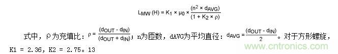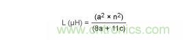 式中,a為線圈的平均半徑,單位為英寸;n為匝數(shù);c為線圈磁芯的寬度(rOUTER - rINNER),單位為英寸。當(dāng)線圈的c  > 0.2a時(shí)11,該計(jì)算方法的精度在5%之內(nèi)。