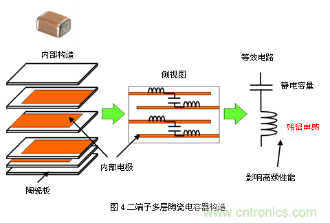 目前所使用的電容器多為片狀多層陶瓷電容器。圖4為二端子片狀多層電容器的結(jié)構(gòu)概念 圖。其結(jié)構(gòu)表現(xiàn)為,夾著電介質(zhì)薄片,分別與兩側(cè)外部電極連接的內(nèi)部電極交錯(cuò)層疊。由于其為片狀結(jié)構(gòu),且無引線,因此該部分沒有殘留電感。然而,由于其內(nèi)部 還存在微量電感,因此在較高頻率下將導(dǎo)致性能下降。