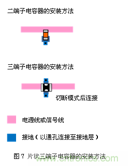 片狀三端子電容器具貫通端子與接地端子,因此與普通的二端子電容器相比,安裝方法有所不同。圖7為安裝示例。