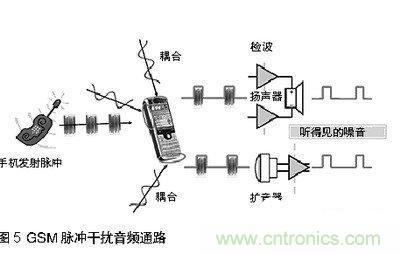 當手機與基站通訊,或兩個手機彼此接近時,發(fā)射脈沖通過擴音器,揚聲器,或頭戴式耳機線傳人音頻通路。見圖5。結(jié)果是音頻質(zhì)量大幅降低。