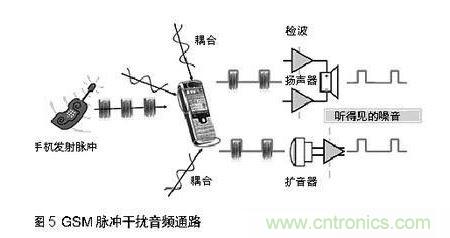 當(dāng)手機(jī)與基站通訊,或兩個(gè)手機(jī)彼此接近時(shí),發(fā)射脈沖通過擴(kuò)音器,揚(yáng)聲器,或頭戴式耳機(jī)線傳入音頻通路。見圖5,結(jié)果是音頻質(zhì)量大幅降低。