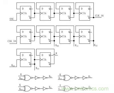 本文中所設計的頻率抖動控制模塊是通過計數(shù)器來控制圖 2 中 M6~ M12開關管的通斷來周期性的改變充放電電容的大小來實現(xiàn)的。頻率抖動控制模塊的電路圖如圖 3 所示,由7 個 D 觸發(fā)器串聯(lián)構(gòu)成 512 分頻觸發(fā)器,第 8 個 D 觸發(fā)器的輸出信號加入到異或門用于實現(xiàn)計數(shù)器 K4,K2,K1,K0加減法計數(shù)切換,保證加入到張弛振蕩器中的電容不會出現(xiàn)瞬時的大容值的變換,從而引起振蕩器的振蕩頻率有過大的變化。本文中所設計振蕩器的中心頻率為100 kHz,頻率抖動范圍為±4 kHz,頻率從 96 kHz,100 kHz,104 kHz 周期性地變化,頻率抖動周期為 5 ms。