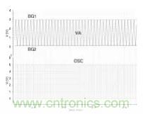 由圖1可以看出,頻率抖動振蕩器由一個張弛振蕩器加上一個頻率抖動模塊構(gòu)成。其工作原理:首先,開關 S1閉合,電流源 I0給電容 Cc充電,充電剛開始時電容 Cc上極板的電壓小于 BG1和 BG2,RS 觸發(fā)器的輸出被置為低電平 0,當電容上極板電壓 VA大于 BG2時,RS 觸發(fā)器的輸出狀態(tài)處于保持狀態(tài),直到上極板電壓 VA大于 BG1之后 RS 觸發(fā)器的輸出翻轉(zhuǎn)被置為高電平1;此時,開關 S2導通,電流源 I1給電容Cc放電,當VA減小到小于 BG1時,RS 觸發(fā)器的輸出處于保持狀態(tài),當VA減小到小于 BG2時,RS 觸發(fā)器翻轉(zhuǎn)被置為低電平 0 ;于是,開關 S1又閉合開始對 Cc充電,如此周而復始,得到一個頻率固定的振蕩器。圖1中的電流源I0、 I1的電流相等,則振蕩器的占空比為 0.5。頻率抖動控制模塊是通過計數(shù)器來周期性的切換加入到張弛振蕩器中充放電電容的大小,改變電壓 VA的充放電速度,從而來達到周期性的改變振蕩器頻率的目的,即實現(xiàn)了振蕩器頻率的抖動。