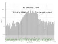 圖 6、圖 7 分別為對不加頻率抖動和加了頻率抖動進行傅里葉分析的頻譜圖,對比圖 6 和圖 7 可以看出加了頻率抖動電路之后在固定頻率處的頻譜幅值下降了大約11 dB,由此可見頻率抖動電路對減小 EMI 的效果非常明顯。