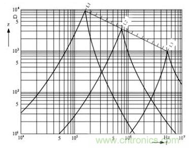由圖中可以看出,電感線圈的阻抗開始的時候是隨著頻率升高而增大的,但當它的阻抗增大到最大值以后,阻抗反而隨著 頻率升高而迅速下降,這是因為并聯(lián)分布電容的作用。當阻抗增到最大值的地方,就是電感線圈的分布電容與等效電感產(chǎn)生并聯(lián)諧振的地方。圖中,L1 > L2 > L3,由此可知電感線圈的電感量越大,其諧振頻率就越低。從圖2中可以看出,如果要對頻率為1MHZ的干擾信號進行抑制,選用L1倒不如選用L3,因為 L3的電感量要比L1小十幾倍,因此L3的成本也要比L1低很多。