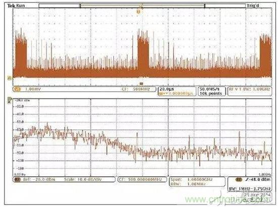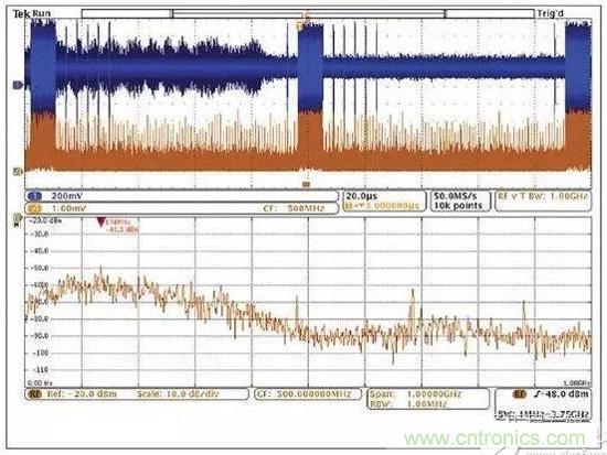 然而,混合域示波器(MDO)的推出使情況有了改觀,它能提供同步的而且與時(shí)間相關(guān)聯(lián)的觀察和測(cè)量功能。如圖5所示的這種儀器能夠相當(dāng)容易地讓我們觀察哪個(gè)信號(hào)與哪個(gè)EMI事件同時(shí)發(fā)生,從而可以簡(jiǎn)化EMI排查過程。