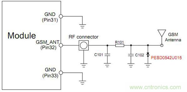 對于天線的高頻信號(hào)保護(hù),可以采用0402或0201的超低電容 ESD器件PESD0542U015,可以節(jié)約布板空間,且因?yàn)?.05PF的電容,可以保證高頻、高速信號(hào)的完整傳輸。