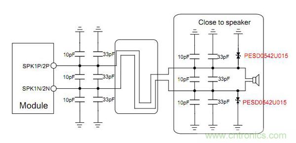 對于揚(yáng)聲器的靜電保護(hù),可以采用0402或0201的超低電容 ESD器件PESD0542U015,可以節(jié)約布板空間,且因?yàn)?.05PF的電容,可以保證此模擬信號(hào)的完整傳輸。