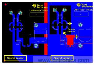 圖4和圖5之間噪聲結(jié)果的不同主要是由于PCB布線差異所致,如圖6所示。圖5的布線中(圖6的右側(cè)),大面積覆銅(GND)包圍著DM濾波器,并和Vin走線形成了一些寄生電容。 這些寄生電容為高頻信號旁路濾波器提供了有效的低阻抗路徑。 因此,為了最大限度地提高濾波器的性能,需要移除濾波器周圍所有的覆銅,如圖6左側(cè)的布線。