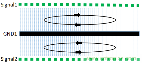 根據(jù)麥克斯韋方程,分立的帶電體或電流,它們之間的一切電的及磁的作用都是通過它們之間的中間區(qū)域傳遞的,不論中間區(qū)域是真空還是實體物質(zhì)。在PCB中磁通總是在傳輸線中傳播的,如果射頻回流路徑平行靠近其相應(yīng)的信號路徑,則回流路徑上的磁通與信號路徑上的磁通是方向相反的,這時它們相互疊加,則得到了通量對消的效果。