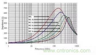 讓我們首先來(lái)看一下阻抗值同為600ohm@100MHz但尺寸大小不同的磁珠在不同偏置電流電流和工作頻率下的特性。