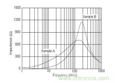 磁珠A和磁珠B的阻抗峰值都在100MHz和200MHz之間,但磁珠A阻抗頻率曲線比較平坦,磁珠B則比較陡峭。