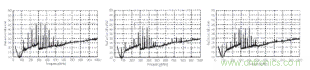 下面是上述三種情況對(duì)應(yīng)的EMI測(cè)試結(jié)果。結(jié)果是磁珠A和磁珠B都會(huì)對(duì)EMI噪聲產(chǎn)生很大的衰減。磁珠A在整個(gè)EMI頻譜范圍內(nèi)的衰減要稍好于磁珠B。
