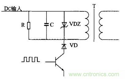 開關(guān)管或 二極管在開通和關(guān)斷過程中,由于存在變壓器漏感和線路電感,二極管存儲(chǔ)電容和分布電容,容易在開關(guān)管集電極、發(fā)射極兩端和二極管上產(chǎn)生尖峰電壓。通常情況下采用RC/RCD吸收回路,RCD浪涌電壓吸收回路如圖2所示。